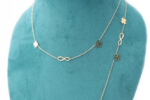 Przepiękny złoty komplet celebrytek, wykonany ze stali nierdzewnej 316L, pozłocony. Zestaw składa się z łańcuszka i bransoletki, które są ozdobione KONICZYNKAMI ORAZ ZNAKIEM NIESKOŃCZONOŚCI.