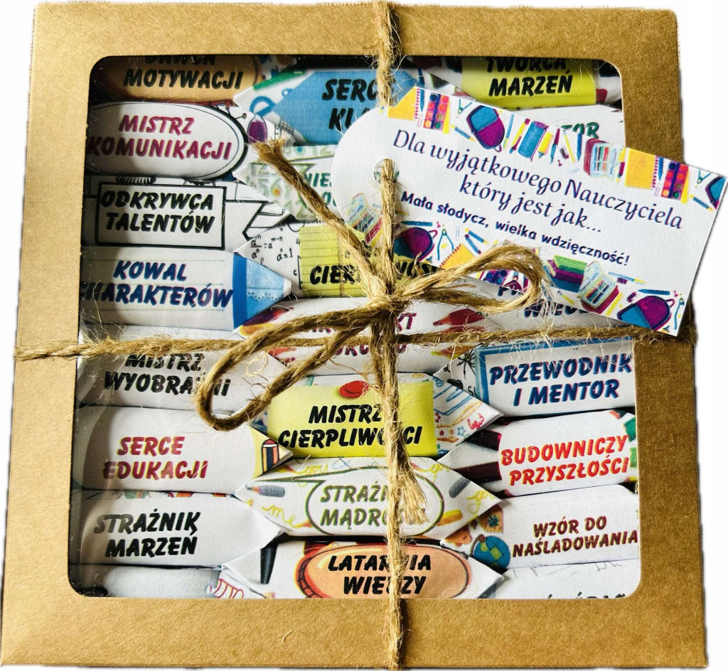 ❤️23 sztuki pysznych, świeżych krówek etykietkami zawierającymi zabawne i wzruszające teksty o nauczycielach.