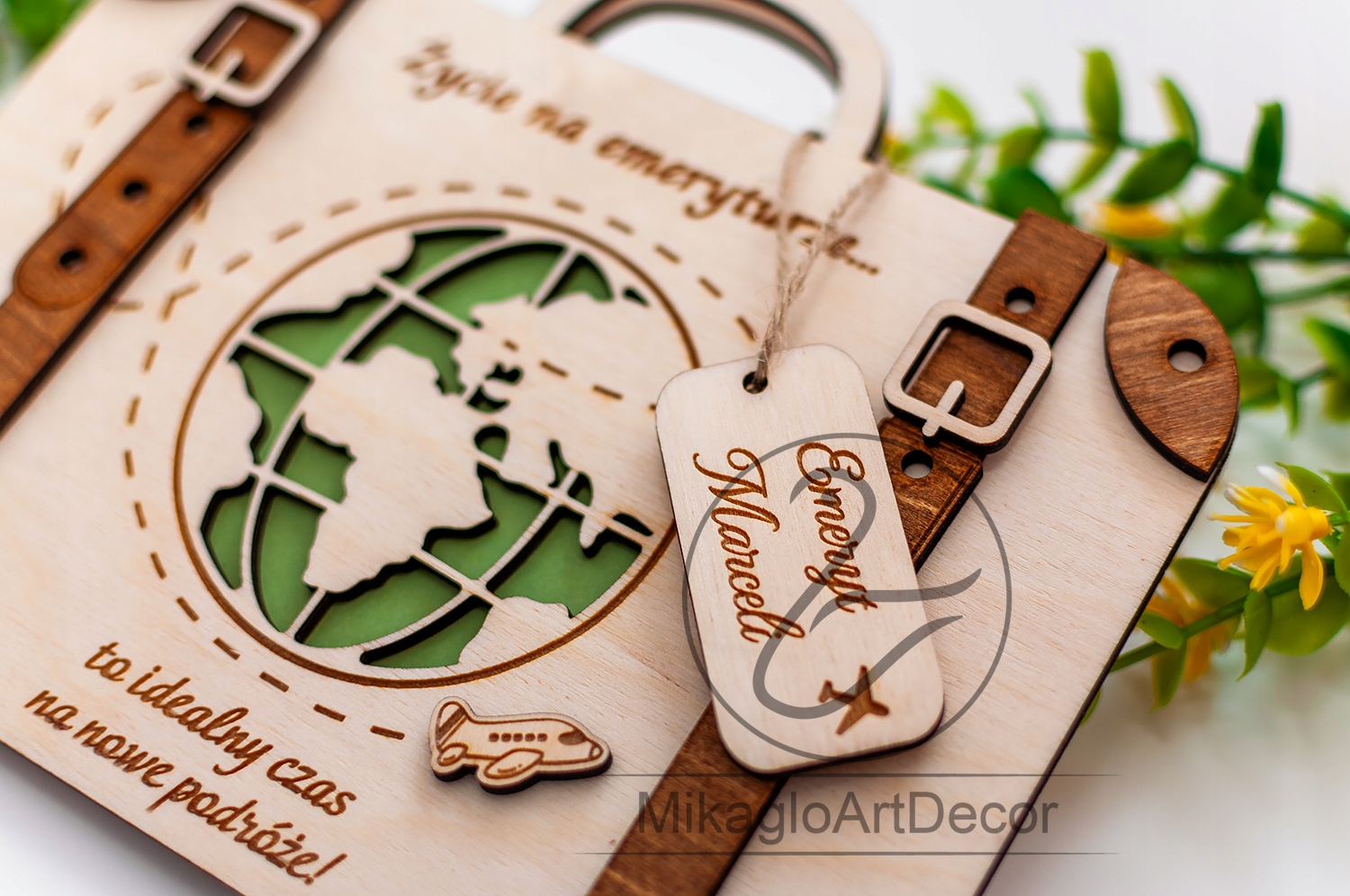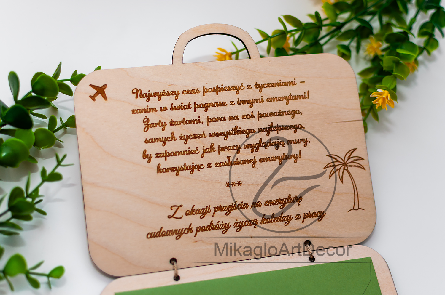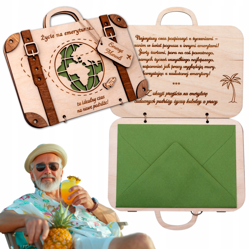 Emerytura Kartka Drewniana Walizka je idealno darilo za poslovilno slovo od službe. Ta unikatna kartka v obliki potujoče walizke je popolno p