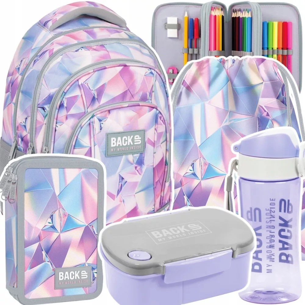 Zestaw zawiera: plecak szkolny, piórnik trójkomorowy z wyposażeniem, worek na obuwie, bidon oraz śniadaniówkę.