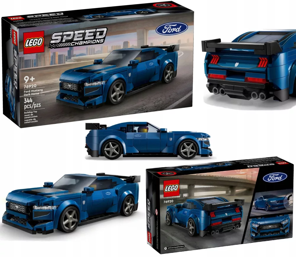LEGO® Speed Champions Sportowy Ford Mustang Dark Horse (76920) to wierna replika potężnego, kultowego amerykańskiego samochodu. Dzieci w wieku od dziewięciu lat będą zachwycone kolekcjonowaniem, budowaniem, eksponowaniem i odgrywaniem akcji z tym niebieskim samochodem.