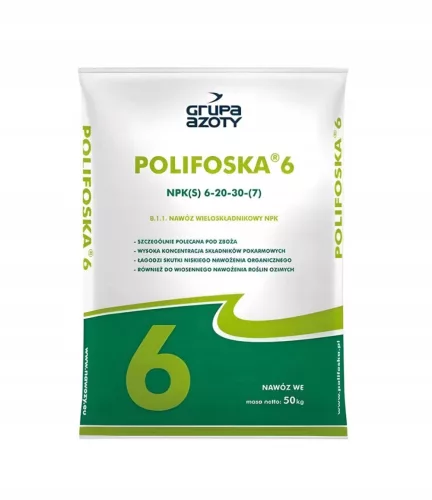 Polifoska 6 to kompleksowy nawóz wieloskładnikowy do stosowania przedsiewnego (zaleca się wymieszać z glebą na głębokość 10‑20 cm) pod wszystkie rośliny uprawne: zboża ozime i jare, rzepak ozimy, kukurydzę, buraki cukrowe, ziemniaki, na użytkach zielonych oraz w uprawie warzyw i sadownictwie. Nawóz Polifoska 6 można stosować również pogłównie na rzepak ozimy wczesną wiosną.