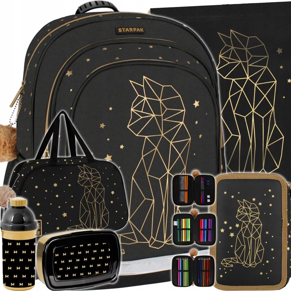 Piękny czarny plecak ze złotą grafiką z kotkiem.