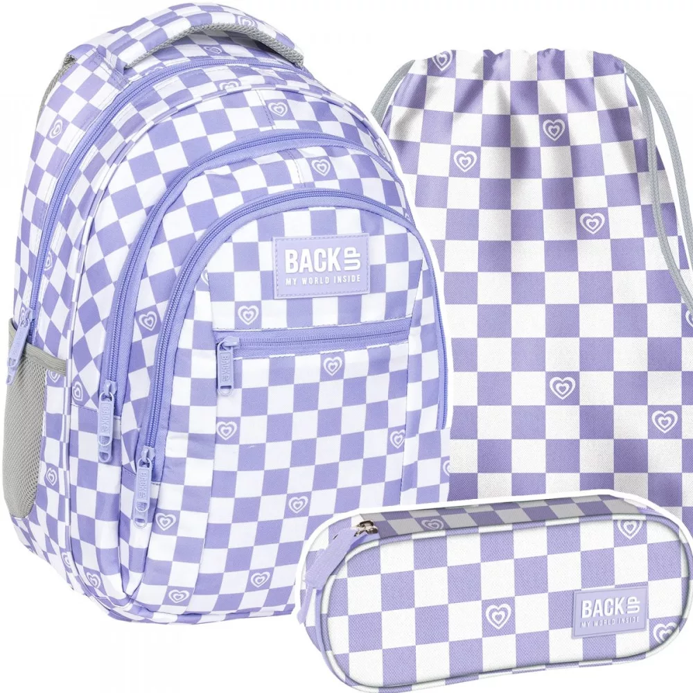 ZESTAW 3 el. Plecak szkolny młodzieżowy BackUP 26 L SZACHOWNICA FIOLET (PLB6O29SET3CZ)