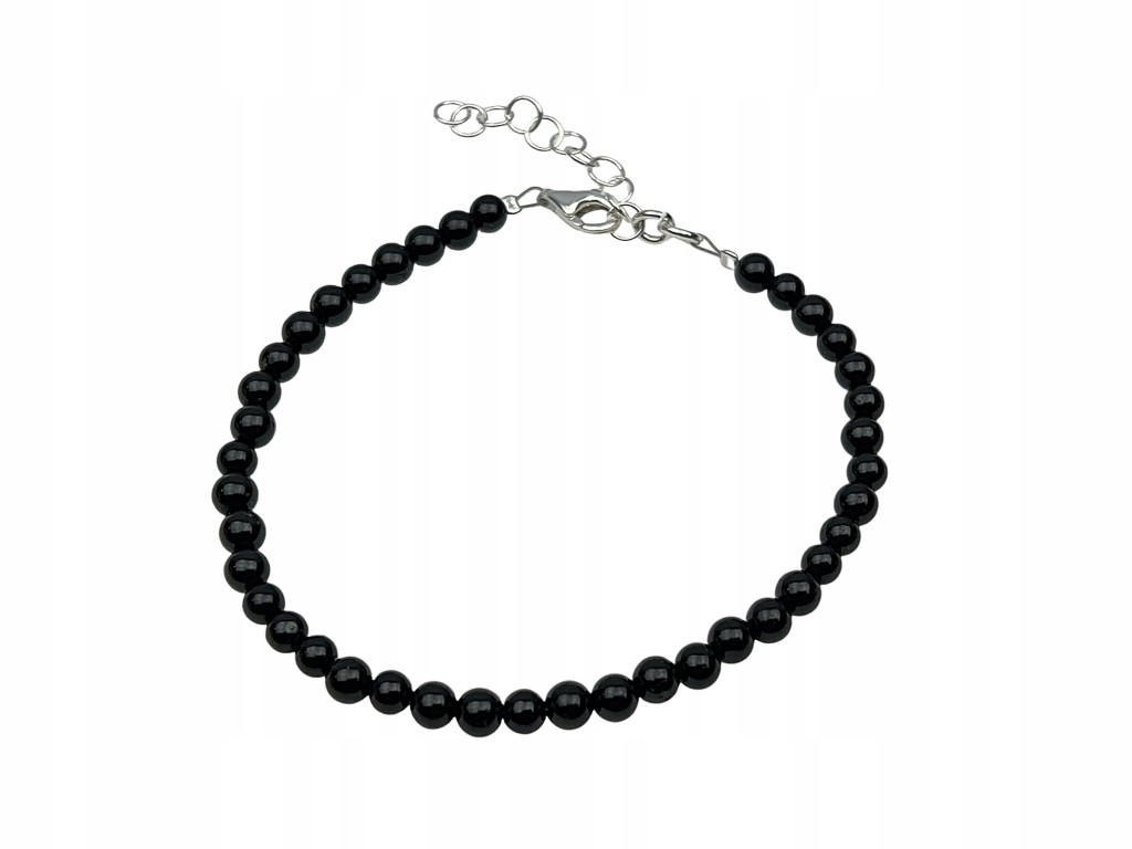 Bransoletka składająca się z kamiennych, okrągłych koralików naturalnego Turmalinu Czarnego. Kamyczki umocowane są na srebrną linkę (próba 925). Dzięki srebrnemu łańcuszkowi bransoletka zyskuje elegancji i będzie pasowała na każdy nadgarstek. Idealny element w codziennej stylizacji.